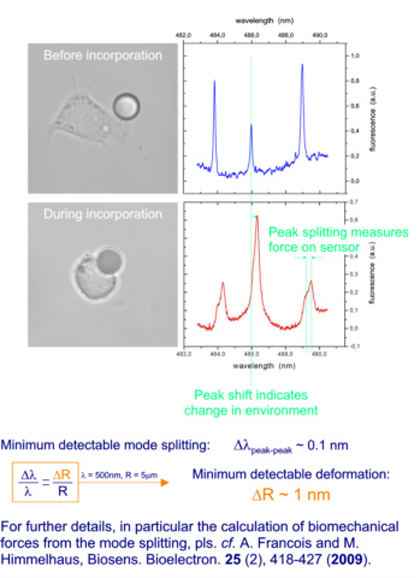 Our sensor particles are sufficiently small for phagocytosis when exposed to live cells, such as macrophages. During this entire process of engulfment by the cell, our sensors can be operated, thereby yielding unrivaled insight into the biomechanics of the process of endocytosis. The data given below gives a brief overview over the key points of this novel approach. For details, we refer to A. Francois and M. Himmelhaus, Biosens. Bioelectron. 25 (2), 418-427 (2009).